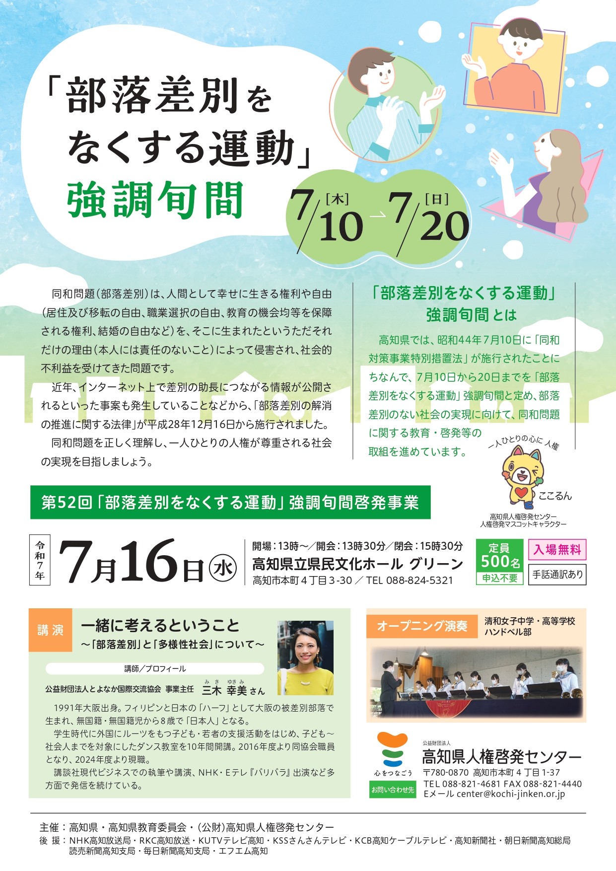 ![]() | 日時:令和7年7月16日(水)13時30分~15時30分 会場:高知県立県民文化ホール グリーンホール 参加者:226名 【オープニング演奏】清和女子中学・高等学校ハンドベル部 【講 演】一緒に考えるということ~「部落差別」と「多様性社会」について~ 講 師 三木幸美さん(公益財団法人とよなか国際交流協会 事業主任) ◆参加者のアンケートより ・人権課題に積極的(前向き)に取り組む当事者の発信が非常に参考になった。清和女子中高のハンドベルがとても素敵でした。 ・わかろうとする姿勢が大切なんだなと感じた。 ・部落差別に対しての意識がかわるようになりました。 ・これまでの自分の人権意識を改めて問い直す機会でした。人は対話の中で世の中をよりよくすることができると感じました。世の中のちがいを自分事としてこれから考えていきたいと思います。 ・「偏見や差別をしない、させない」という考え方ではなく、「ちがいを尊重する」ことが大切ではないかと考えるようになりました。 〇主催:高知県・高知県教育委員会・(公財)高知県人権啓発センター |
