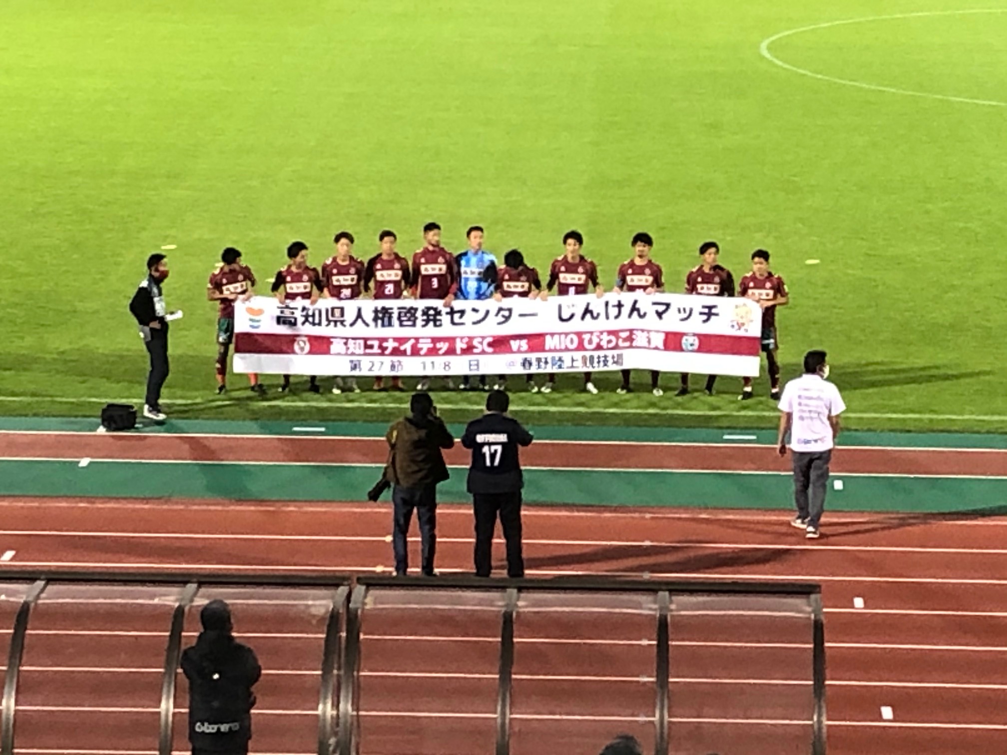 ![]() | 日本フットボールリーグ27節 高知ユナイテッドSC 対 MIOびわこ滋賀 令和2年11月8日(日)18:00~ 高知県立春野総合運動公園陸上競技場 来場者数:496名 共催・協力:高知地方法務局人権擁護課、高知市人権同和・男女 共同参画課、高知県人権擁護委員連合会 |