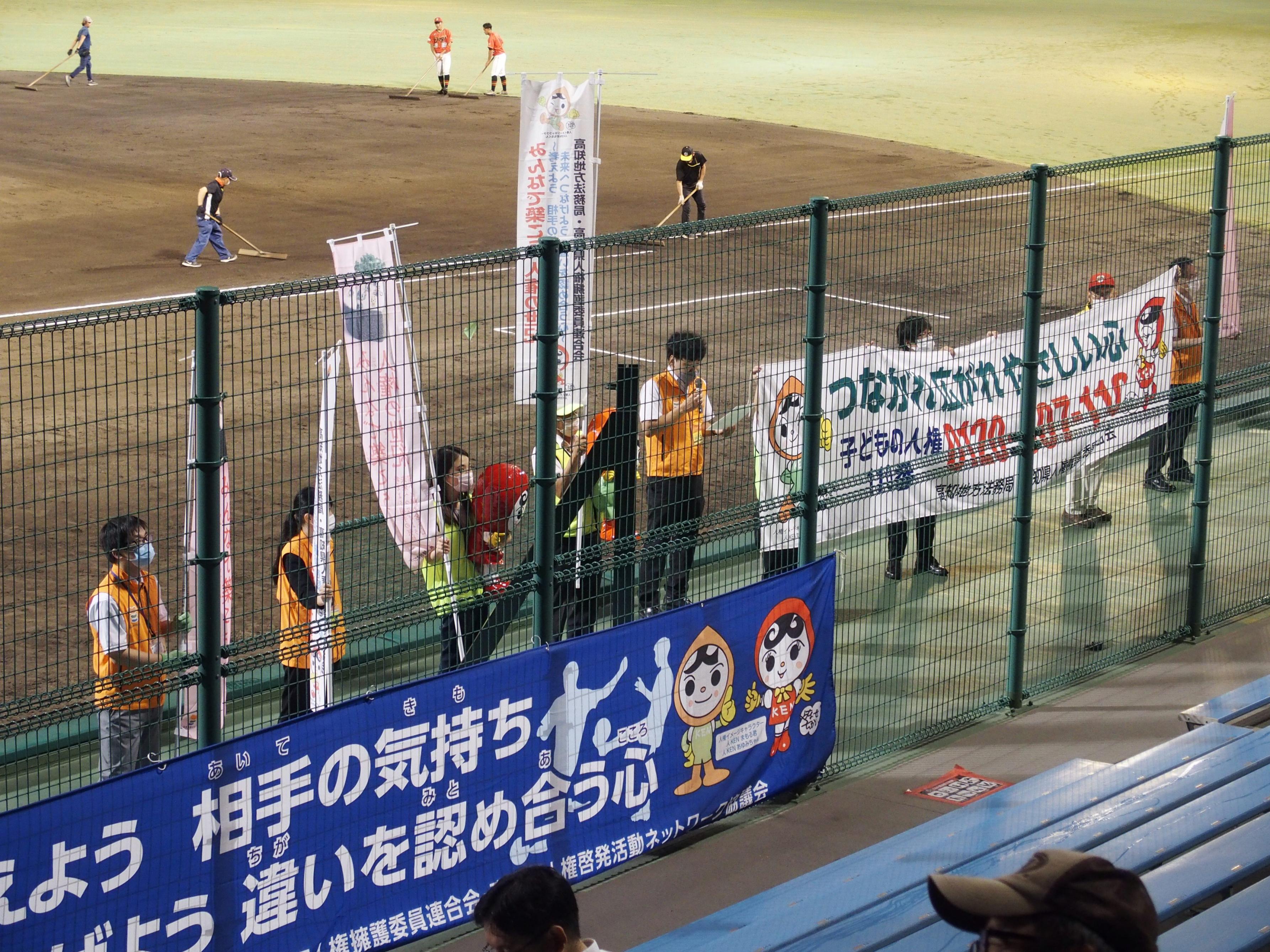 | 球場の電光掲示板や試合途中のアナウンスで、新型コロナ感染症の誹謗中傷や児童虐待の防止について啓発しました。また、人権に関心を持ってもらうよう、5回終了時にグランド内で横断幕を掲げました。 【意見・感想】 ・この度TVニュース等で思い知った事は「コロナ差別」です。最も恐ろしいのは人間だと…。人の気持ちを考えられる人間になりたいです。 ・コロナの中イベントが規制されていますが出来ること可能なことをがんばって下さい。 ・コロナウイルスで大変でしょうが一人一人が輪になって頑張りましょう。 ・189覚えました!電話をする勇気を持とうと思いました!! ・思いやれる社会になってほしい。 ・大事なイベントである。継続して開催してください。 | |